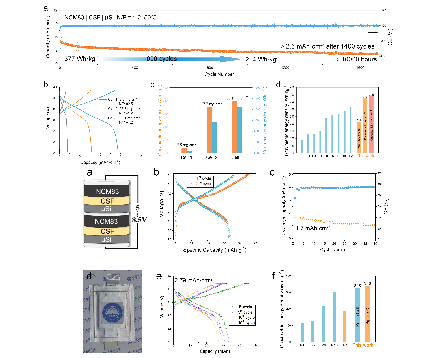 研究團隊以正極和薄層電解質的界面熔融粘結為策略,制備出的一體化全固態電池,適配鋰銦負極,707次循環后容量保持率大于80%;適配純硅負極( Si),478次循環后容量保持率大于80%,可循環2000次。在高負載NCM83(28.5 mg cm-2)|| Si全電池中,經過9200小時、1400次循環后,其面容量保持大于2.5 mAh cm-2,循環壽命超過10000小時,進一步提升NCM83載量到53.1 mg cm-2,其能量密度超過390 Wh/kg,1020 Wh/L,高于目前文獻所報道的高鎳三元體系的硫化物全固態電池。研究團隊基于該策略分別組裝了Bipolar(5-8.5V)和高面載量(2.79 mAh/cm2)單片軟包二次電池,表明熔融黏結技術具有出色的實用性潛力,對硫化物全固態電池的商業化具有重要意義,為全固態電池未來科學研究和工藝技術發展提供有力參考。