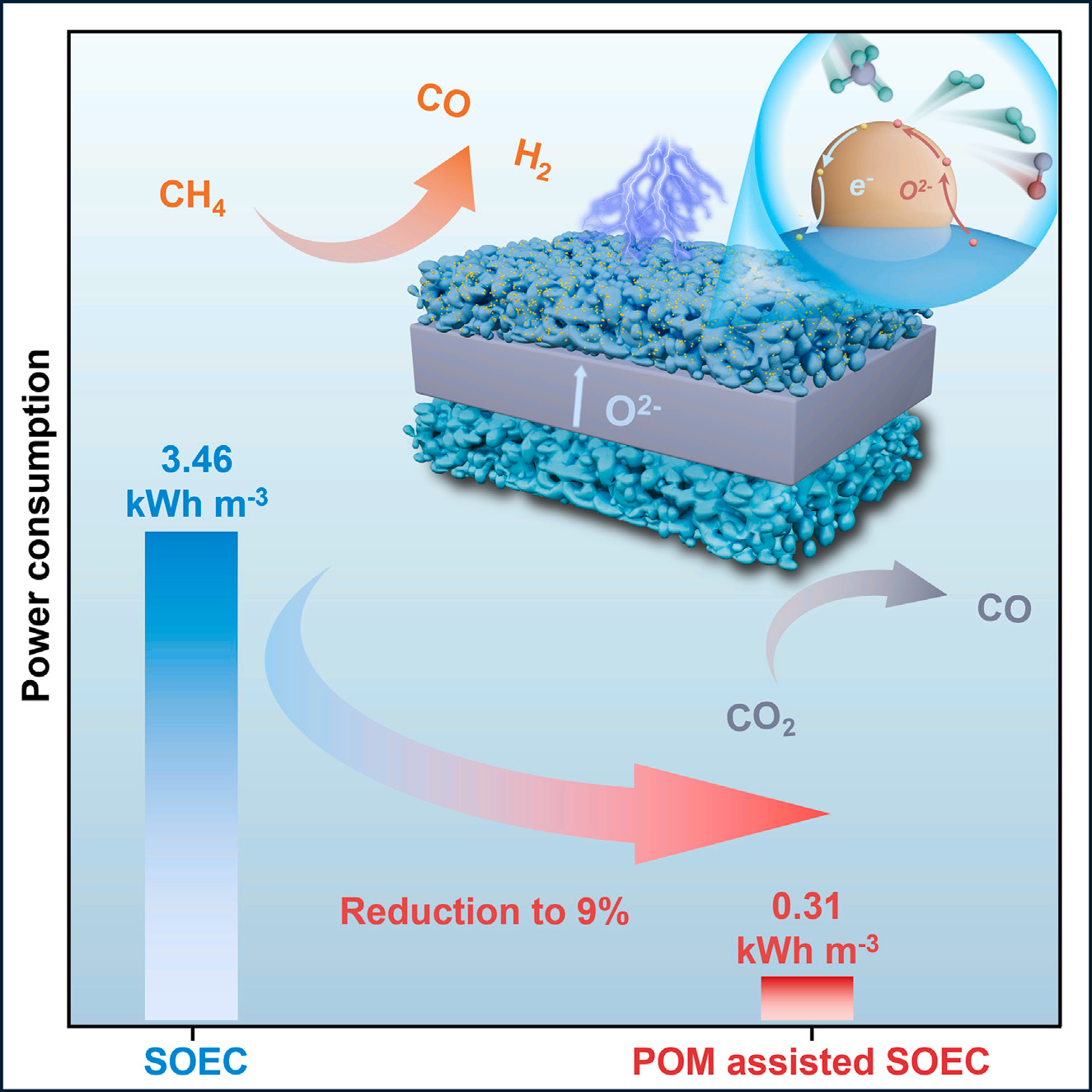 該團隊長期致力于基于固體氧化物電解池的高溫電催化研究,前期利用原位溶出和高溫分散法開發出了一系列高活性電化學表界面,用于高溫電極反應。本工作中,團隊通過調控La0.6Sr0.4Ti0.3Fe0.7-xCoxO3- 陽極鈣鈦礦中B位Co\Fe比例,優化B位過渡金屬溶出能,實現在La0.6Sr0.4Ti0.3Fe0.5Co0.2O3- (LSTFC2)鈣鈦礦表面原位溶出生成平均粒徑最小為7nm、顆粒密度最高為1087個 m-2的CoFe合金納米顆粒,為陽極CH4轉化提供了充足活性位點。研究還發現,電驅動產生的溢流氧也可進一步促進甲烷吸附活化、抑制積碳形成,從而提升了陽極催化劑活性和穩定性。800 C下,LSTFC2陽極CH4轉化率可達到86.9%,CO選擇性達到90.1%,連續穩定運行1250 小時無顯著衰減。電化學性能測試表明,陽極引入甲烷半氧化重整反應后,CO生產能耗從傳統SOEC的3.46 kWh/m3降低到0.31 kWh/m3。本工作為C1小分子升級轉化提供了新的研究思路。