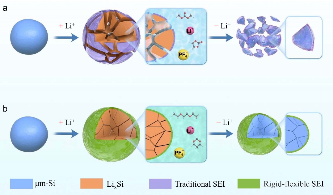 相比于傳統納米硅負極,微米硅負極在材料成本、振實密度、電極制備工藝方面具有巨大的優勢。研究發現,在光伏硅片切割過程中產生的光伏硅廢料具有成本低廉、來源廣泛及純度高等優勢,可以作為微米硅負極材料的理想來源。由于微米級硅顆粒在鋰化過程中會產生近300%的體積膨脹,導致其極易破碎粉化進而引發容量的急速衰減。傳統微米硅負極的改性方法主要集中于對其進行碳包覆或引入高強度粘結劑,雖然此類改性方式取得了一定的效果,但距離商業化庫倫效率超過99.9%的要求還存有較大差距。