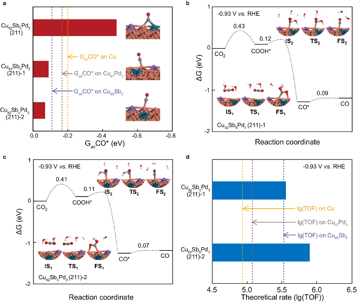 本工作中,肖建平團隊探究了單原子合金催化劑Cu92Sb5Pd3電催化CO2還原表現出高CO選擇性的原因。研究發現,Pd和Sb單原子的共摻雜作用,降低了Cu基催化劑的表面能,提高了Cu基催化劑穩定性;改變了電荷分布,降低了d-band 中心,減弱了CO*的吸附,提升了CO的選擇性。通過電荷外插值法,肖建平團隊計算了工作電勢下的CO2還原反應的反應能壘,并通過微觀動力學模擬得到了CO*覆蓋度、CO法拉第效率,模擬結果與實驗結果有較好的吻合。該研究為設計高活性和特定選擇性電催化材料提供了新思路。
