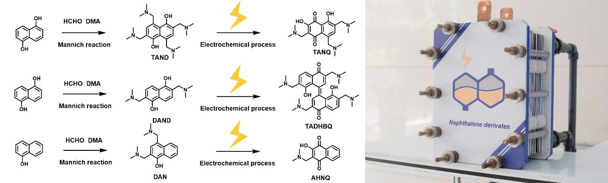 本工作中,為合成低成本、高穩定性的有機活性分子,李先鋒和張長昆團隊以大宗性化學品羥基萘作為底物,采用化學合成和電化學合成相結合的制備策略,制備出多取代基修飾的萘醌活性分子。該方法簡單高效,無需復雜的分離純化過程,簡化了合成步驟的同時降低了成本。此外,團隊通過原位核磁共振和離線液質聯用等譜學方法分析了不同結構衍生物的電化學反應機理。結果表明,在電化學氧化階段,萘衍生物羥基對位側的芐胺官能團離去,并與水反應氧化生成萘醌,進一步與水加成生成多取代的萘醌活性分子。理論計算和實驗結果表明,二甲胺官能團提高了萘醌分子的溶解性的同時對分子活性中心起到保護作用,從而提升了高濃度電解液的穩定性。研究團隊進一步采用一體化裝置將萘活性分子的合成過程進行放大,單次可制備5千克萘衍生物分子,并進行了電堆穩定性測試。