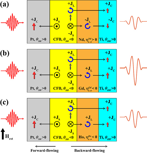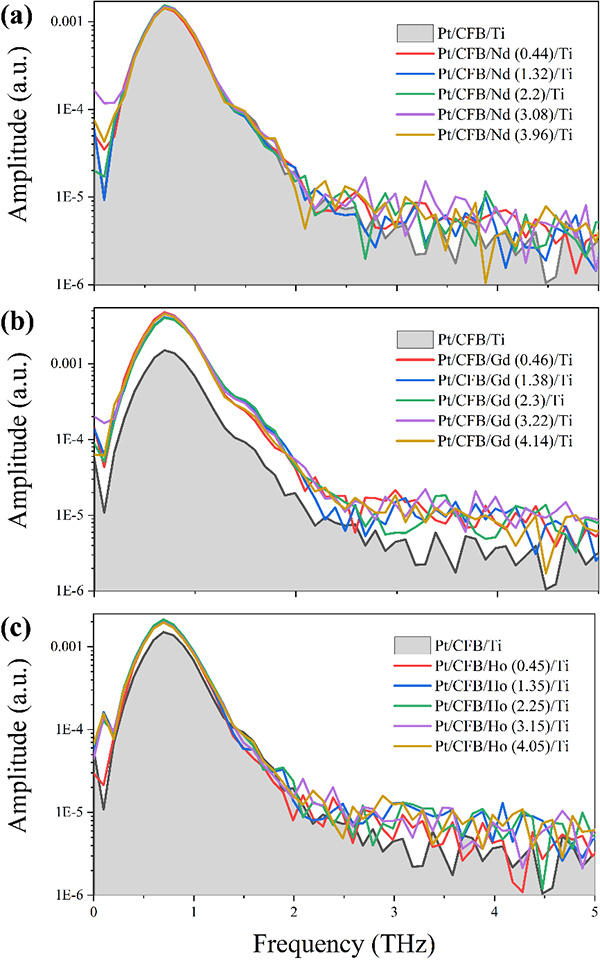 中國科學院金屬研究所沈陽材料科學國家研究中心功能材料與器件研究部基于過去多年在自旋電子學研究領域的工作積累,通過和中山大學物理學院合作,在多層膜異質結構中引入稀土(RE)金屬插層,發現了和稀土種類密切相關的自旋-軌道流轉化機制。結果發現,在Pt/CoFeB(/Ti)異質結中,太赫茲的產生主要依靠逆自旋霍爾效應和逆軌道霍爾效應實現自旋-電荷、自旋-軌道-電荷流的轉化,從而對外輻射太赫茲脈沖。將稀土金屬Nd、Gd和Ho插入到CoFeB和Ti層中間后,稀土的自旋軌道耦合顯著地影響了CoFeB-Ti一側的自旋-軌道流轉化過程。具體如下:輕稀土Nd(4f電子殼層少于半滿)將負極化的自旋流(-JS)轉化為負極化的軌道流(-JL),隨后在Ti層中轉化為負極化的電荷流(-JC),最終導致含稀土Nd插層樣品的太赫茲峰對峰強度(THz p-p)弱于對照樣品Pt/CFB/Ti的強度值。反之,重稀土Gd和Ho(4f電子殼層半滿及多于半滿)將負極化的自旋流(-JS)轉化為正極化的軌道流(+JL),隨后在Ti層中轉化為正極化的電荷流(+JC),從而在含重稀土插層的樣品中觀察到了增強的太赫茲峰對峰強度。另一方面,對照樣品(Pt/CoFeB/RE和Pt/CoFeB/Ti/RE)的太赫茲測量結果可以排除稀土金屬自身的自旋-電荷流轉化的影響。快速傅里葉變換結果進一步證明,稀土金屬Gd有助于提高太赫茲輻射的整體頻譜范圍和強度。