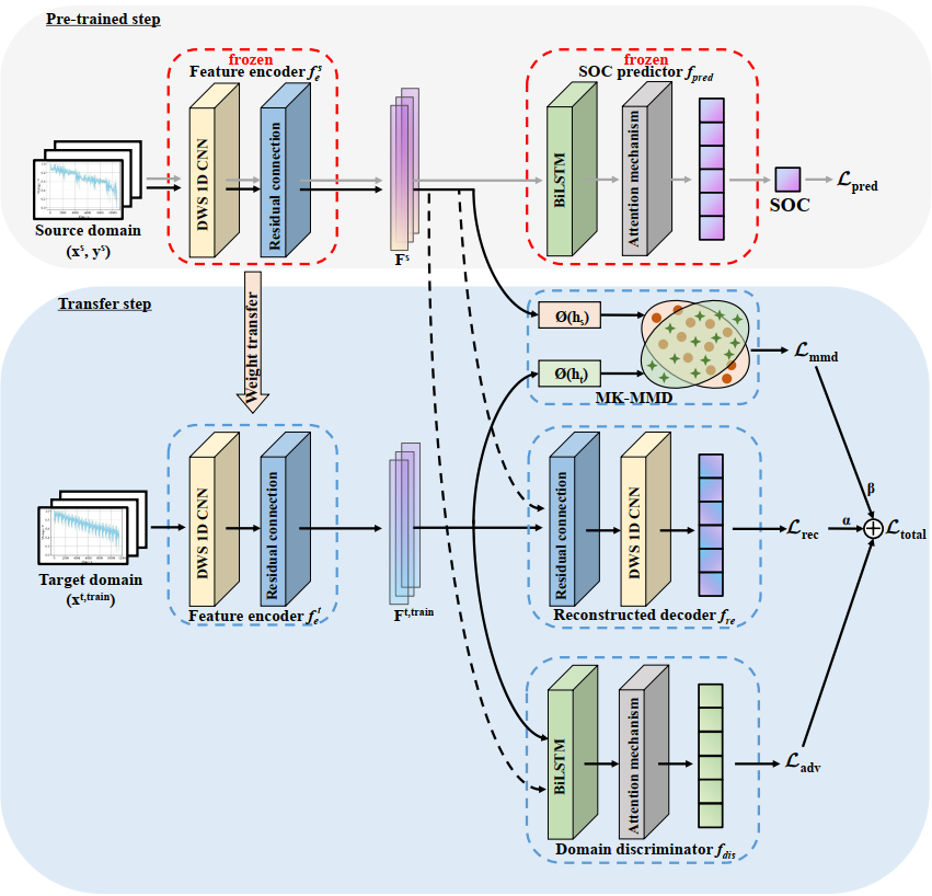 近日,中國科學院大連化學物理研究所能源催化轉化全國重點實驗室動力電池與系統研究部研究員陳忠偉、副研究員毛治宇團隊聯合西安交通大學馮江濤教授,在電池健康管理領域取得新進展。合作團隊開發了一種新型的基于無監督域自適應的電池荷電狀態(SOC)跨域預測框架,有效地解決了傳統方法對于域間差異和目標數據標簽的依賴,為電池實時SOC預估提供了新的思路,有望實現電池SOC的精準跨域評估。同時,該遷移學習框架作為團隊開發的第一代電池數字大腦PBSRD Digit核心模型的重要組成部分,可成為電池智能管理的解決方案之一。