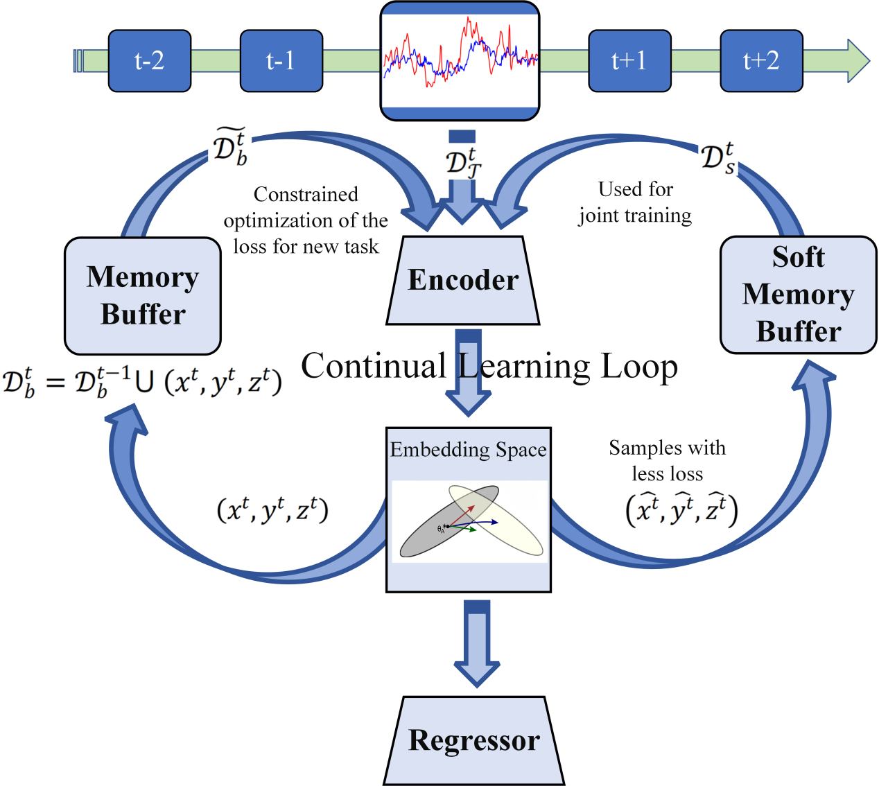 該研究從網(wǎng)絡(luò)訓(xùn)練和網(wǎng)絡(luò)結(jié)構(gòu)兩個(gè)方面改進(jìn)了持續(xù)學(xué)習(xí)方法。團(tuán)隊(duì)通過(guò)基于提示的網(wǎng)絡(luò)參數(shù)學(xué)習(xí)保留了先前任務(wù)的“暗知識(shí)”,有效緩解災(zāi)難性遺忘,同時(shí),引入軟記憶緩沖區(qū)使模型能夠更好地學(xué)習(xí)當(dāng)前任務(wù),從而在穩(wěn)定性與可塑性之間實(shí)現(xiàn)平衡。此外,團(tuán)隊(duì)在網(wǎng)絡(luò)結(jié)構(gòu)層面提出了一種時(shí)間敏感的激活函數(shù)TimeRelu,使網(wǎng)絡(luò)激活閾值隨時(shí)間變化,從而提高了模型的泛化能力。該方法在開源的太陽(yáng)能發(fā)電數(shù)據(jù)集和實(shí)際的磨礦分級(jí)過(guò)程數(shù)據(jù)集上驗(yàn)證了其有效性。