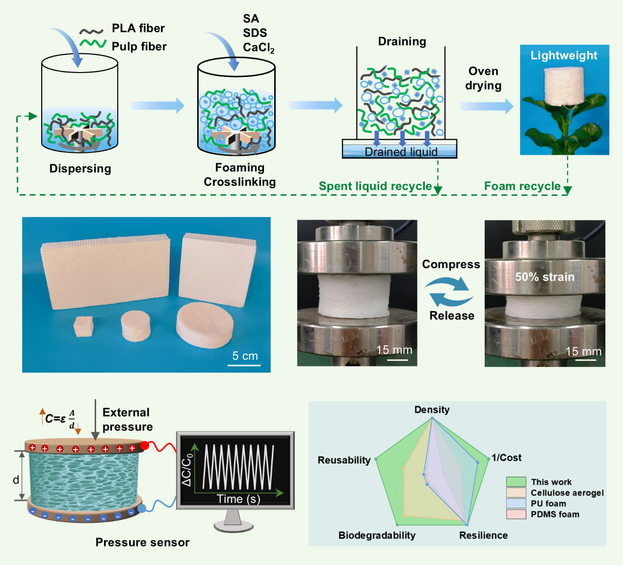 近日,青島能源所系統集成工程中心木質纖維綠碳材料項目部在木質纖維綠碳緩沖材料研發的基礎上,利用濕法發泡和離子交聯策略,將紙漿(Pulp)纖維和聚乳酸(PLA)纖維復合,構筑了一種綠色、超彈新材料,可作為介電層,用于超彈壓力傳感和智能監測等領域。