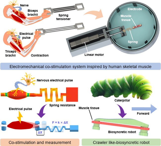 在人體中,骨骼肌組織從胚胎到成年,都受到神經電刺激和機械刺激的共同訓練或維持。科研團隊模仿了人類骨骼肌在神經電脈沖刺激下,克服外界負載進行收縮的自然訓練模式,同時施加電刺激和動態機械刺激,顯著提升了人工骨骼肌組織的蛋白分化率與收縮性能,從而實現類生命機器人的快速驅動。