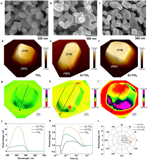 所制備得到的Sc摻雜二氧化鈦的光生電荷分離效率(表面光電壓)提升了200余倍(圖2j),對波長360nm單色光激發產生的光生電荷的利用效率提升到了30%以上,而與其他報道的TiO?樣品相比,在相近測試條件下性能提升了15倍以上,創造了TiO?基光催化材料的性能新紀錄(圖3)。