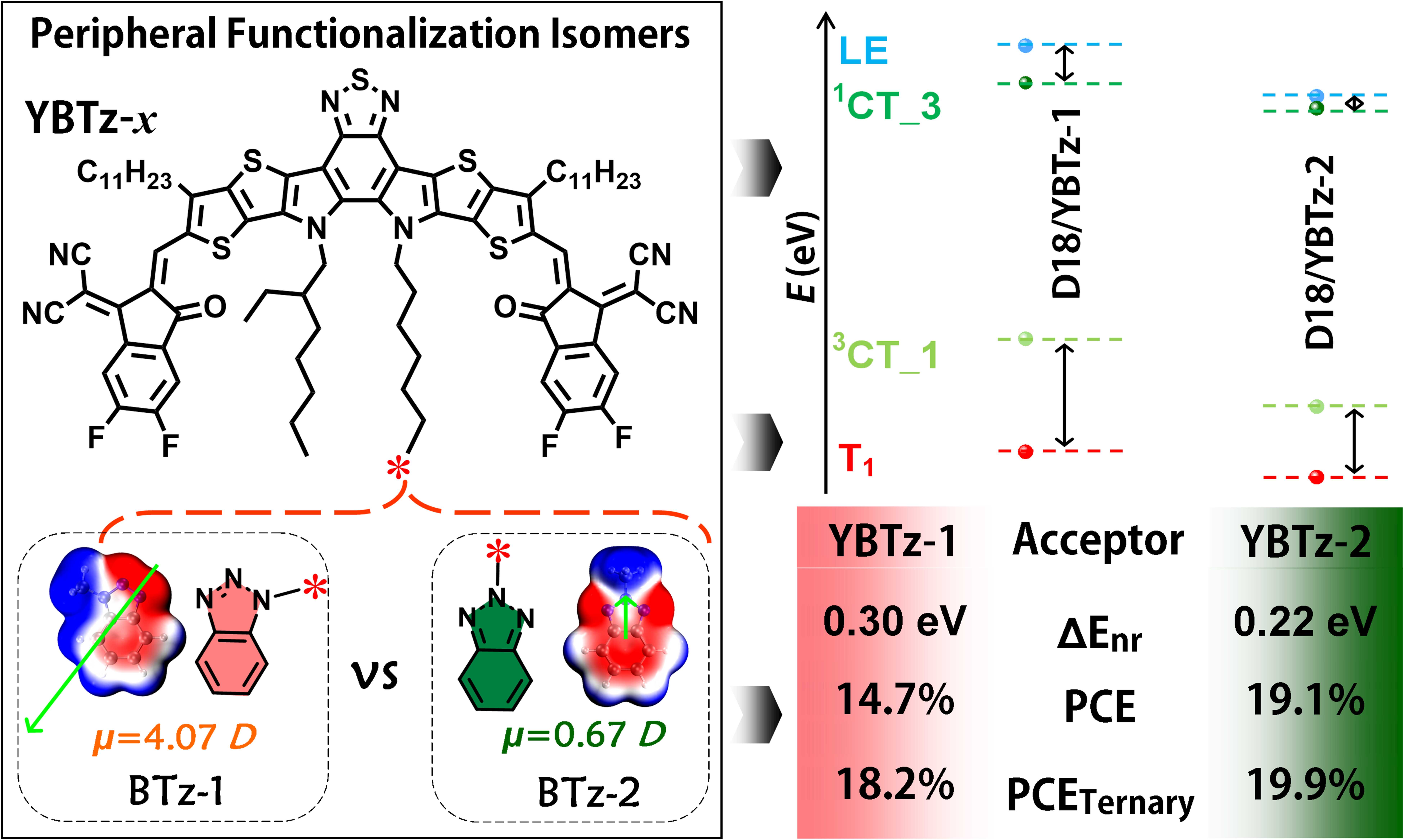 此前研究主要采用苯基作為外圍功能基團調控有機共軛分子的聚集態。苯基作為一種整體呈現弱電負性的共軛基團,其更多發揮位阻作用,調節分子自組裝,同時作為共軛平面參與分子間π-π作用構建及空間超共軛效應。為了進一步明確描述分子外圍強電子效應的功能特性,研究團隊引入具有強電負性的苯并三氮唑(BTz)進行外圍功能調控,并基于一鍋法得到了兩類BTz異構體(圖1)。研究結果不僅證實了外圍基團對分子堆積、給受體相互作用及共混形貌的多重影響,還揭示了外圍缺電子基團通過分子內相互作用誘導主骨架電子云分布重排,進而顯著調控異質結能量景貌及非輻射能量損失(ΔEnr)的作用機制。由于ΔEnr的顯著差異(0.30 eV vs 0.22 eV),兩個外懸異構化的受體分子YBTz-1和YBTz-2表現出明顯不同的光伏性能(14.7% vs 19.1%)。同時,YBTz-2受體的低非輻射能損特性使其在多組分器件中具有很好應用。將YBTz-2進行摻雜后,可以在保持開路電壓基本不變的前提下,顯著改善三組分異質結的納米形貌,同時提高器件的短路電流密度和填充因子,實現了19.9%的高轉換效率。
