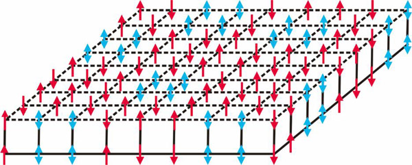 圖1.自旋玻璃三維伊辛模型最小核模型示意圖,其中紅色自旋指向隨機分布,并且藍色自旋存在阻錯。