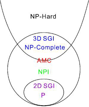 圖2. 自旋玻璃三維伊辛模型體系計算度的相圖。其中NP中間問題(NPI)在NP完全問題與P問題之間,絕對最小核(AMC)模型在NP完全問題與NP中間問題的邊界上。