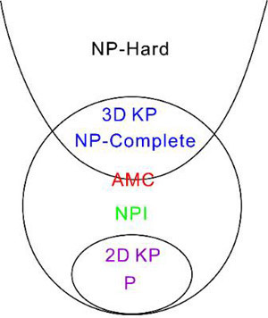 圖3. 背包問題計算度的相圖。其中NP中間問題(NPI)在NP完全問題與P問題之間,絕對最小核(AMC)模型在NP完全問題與NP中間問題的邊界上。