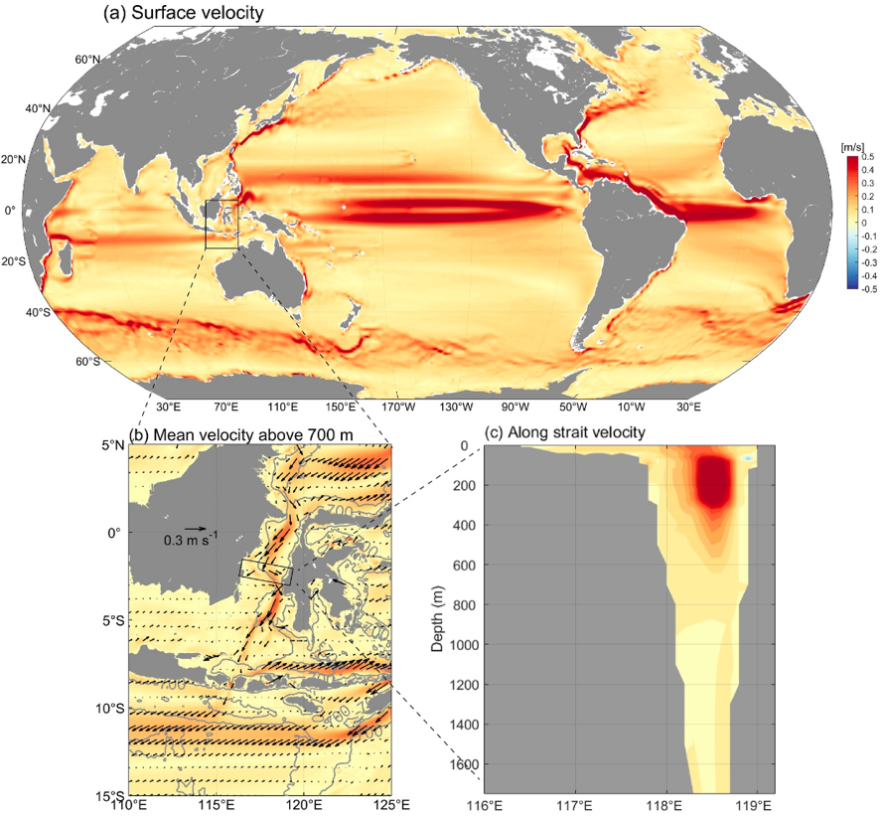 圖1?0.1°高分辨率準全球海洋環流模式HYCOM模擬的全球表面流速(a)和印尼貫穿流結構(b、c)
