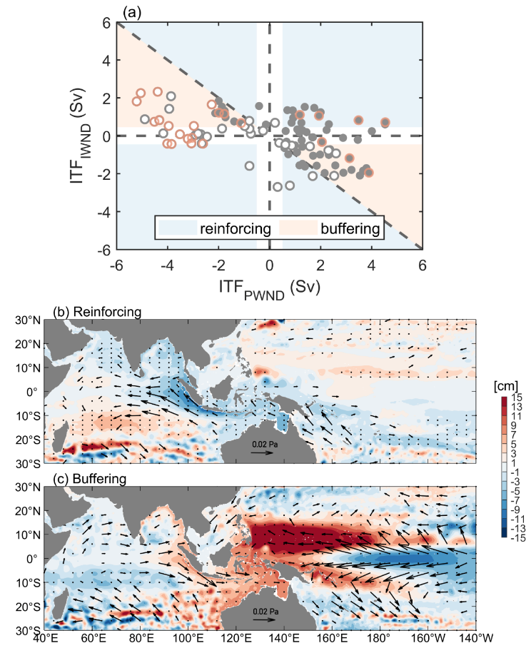 圖2?印度洋對ITF驅動與緩沖效應的定義與機制。(a) 2014–2022年PWND與IWND試驗中ITF異常(單位:Sv,1 Sv ≡ 10? m3 s?1),藍紅背景分別表示緩沖與驅動作用;(b-c)合成的緩沖與驅動作用中風應力與海平面異常空間分布