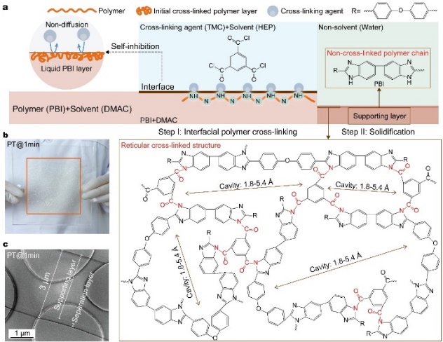 為突破這一限制,李先鋒團隊提出了一種界面交聯新策略,通過將聚合物交聯反應限制在有限的界面空間內,制備出由納米級分離層和支撐層組成的超薄聚合物膜。測試結果表明,分離層中穩健的共價交聯網絡結構提高了膜的機械穩定性,其橫向拉伸強度和縱向硬度均優于商業化的Nafion 212膜,使的所開發聚合物膜材料的厚度可以降低至3 μm。