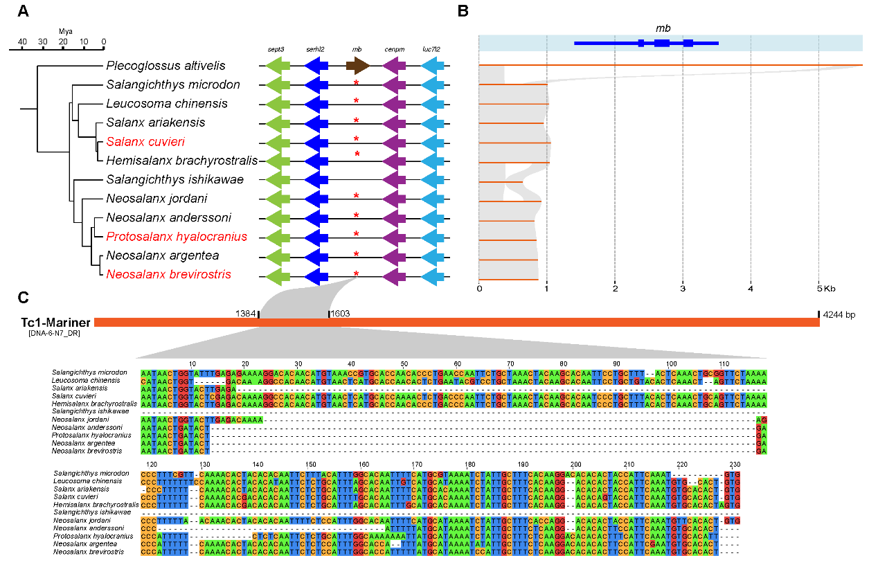 圖1 肌紅蛋白基因在銀魚科魚類共同祖先中完全丟失