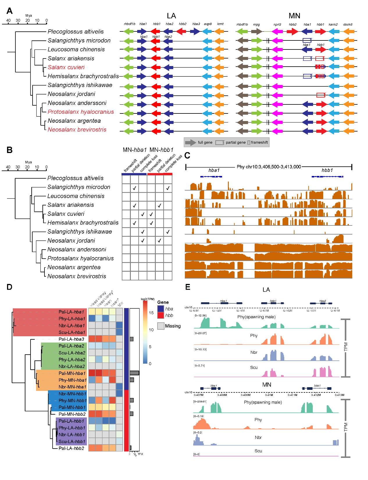 劉進賢團隊通過高質量基因組測序與比較基因組學分析,系統揭示了銀魚科內部物種分化之前便完全丟失了肌紅蛋白基因(圖1),作為具有重要生理功能的基因和蛋白,該丟失在脊椎動物中極為罕見。進一步研究發現,轉座子介導的插入突變是基因丟失的主要分子機制,而非自然選擇作用。此外,研究還發現血氧運輸系統中的核心基因——血紅蛋白基因——在不同銀魚物種中經歷了不同程度的獨立退化,且這一過程發生在肌紅蛋白基因丟失之后(圖2)。由于血紅蛋白的不表達導致選擇壓力的放松,銀魚血氧運輸系統中其他相關基因,如游離血紅蛋白清除基因和紅血細胞生成相關基因,也發生了不同程度的獨立退化。