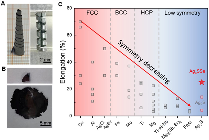 圖1. Ag?SSe的良好室溫塑性以及不同結(jié)構(gòu)材料的室溫延伸率