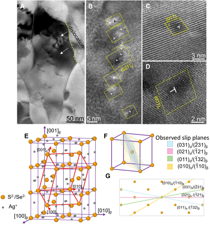 圖2. Ag?SSe變形后位錯(cuò)的HRTEM圖及其對(duì)應(yīng)的準(zhǔn)BCC結(jié)構(gòu)陰離子亞晶格滑移面