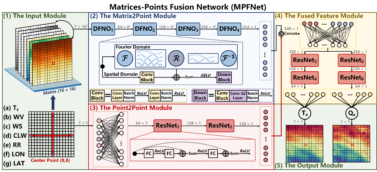 本研究聚焦于提升海表面2米氣溫(Ta)和比濕(Qa)的遙感反演精度,這兩個變量是計算海氣感熱通量(SHF)和潛熱通量(LHF)的關鍵輸入,但傳統方法往往面精度低、區域偏差大等問題。為此,研究團隊創新性地提出了MPFNet(Matrices-Points Fusion Network),融合關鍵點特征和周圍空間矩陣信息,結合Fourier神經算子與殘差網絡架構,實現了高精度的Ta與Qa反演。