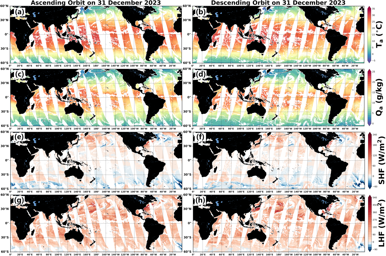 此外,研究團隊基于MPFNet生成了覆蓋11.5年(2012.7–2023.12)分辨率為0.25°的全球逐日Ta、Qa、SHF和LHF產品,為精細化海氣通量估算、氣候變化監測和極端天氣預測提供了高質量數據支撐。