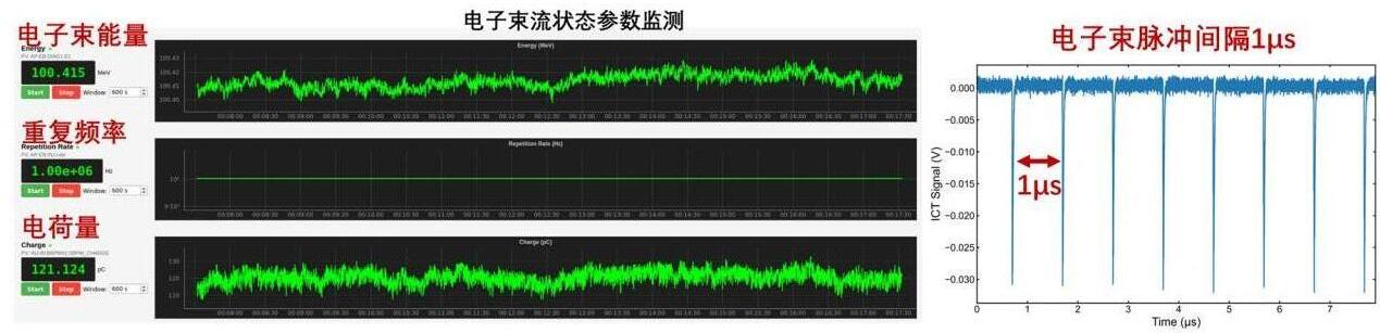 目前,該束流測試平臺已實現0.1毫安平均流強電子束流的穩定加速運行。具體技術指標包括:電子束流能量大于1億電子伏特、單脈沖電荷量大于100皮庫、重復頻率為1百萬赫茲,整個平臺穩定運行持續1小時,束流能量穩定性優于0.01%(RMS)。