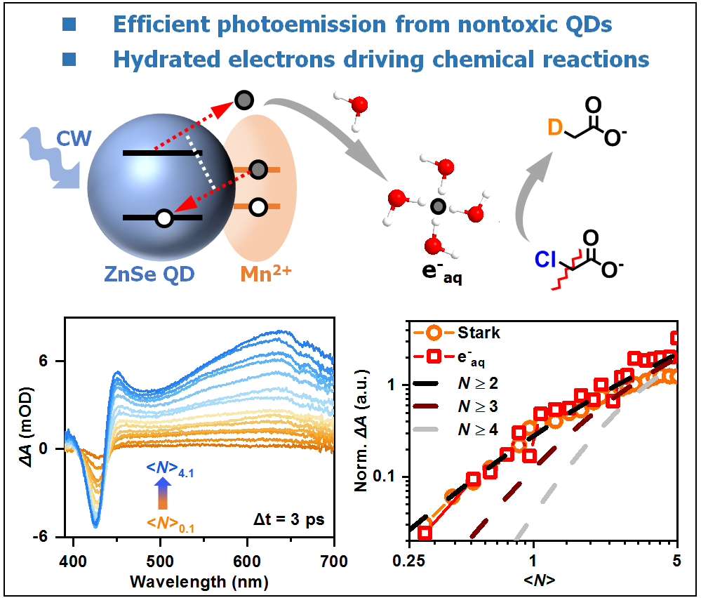 近日,大連化物所化學動力學研究室光電材料動力學研究組吳凱豐研究員團隊在量子點超快光物理與光化學研究中取得新進展,開發(fā)了錳摻雜的硒化鋅(ZnSe)量子點,用于驅(qū)動水合電子的高效生成,并將其應用于有機光催化反應中。