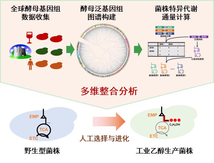 近日,大連化物所生物技術研究部合成微生物學研究組(1823組)周雍進研究員團隊與上海交通大學魯洪中副教授合作,在酵母系統生物學研究中取得新進展。研究團隊通過整合分析全球1807株釀酒酵母菌株的基因組與生態位數據,構建了高覆蓋度的釀酒酵母泛基因組及菌株特異性代謝模型,系統解析了酵母通過基因組精簡與代謝重編程適應多樣化環境的分子機制。