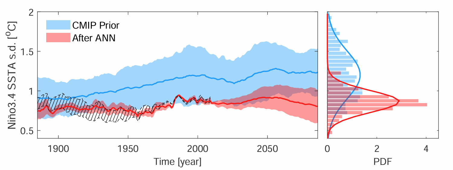 近日,中國科學(xué)院海洋研究所王凡團(tuán)隊攜手南京信息工程大學(xué)張榮華教授、嶗山實驗室蔡文炬院士等,在Nature Communications發(fā)表題為“Projection of ENSO using observation-informed deep learning”的研究論文。該研究開創(chuàng)性地利用觀測數(shù)據(jù)約束的深度學(xué)習(xí)方法,顯著降低了全球關(guān)鍵氣候現(xiàn)象厄爾尼諾-南方濤動(ENSO)未來變化預(yù)估的不確定性。