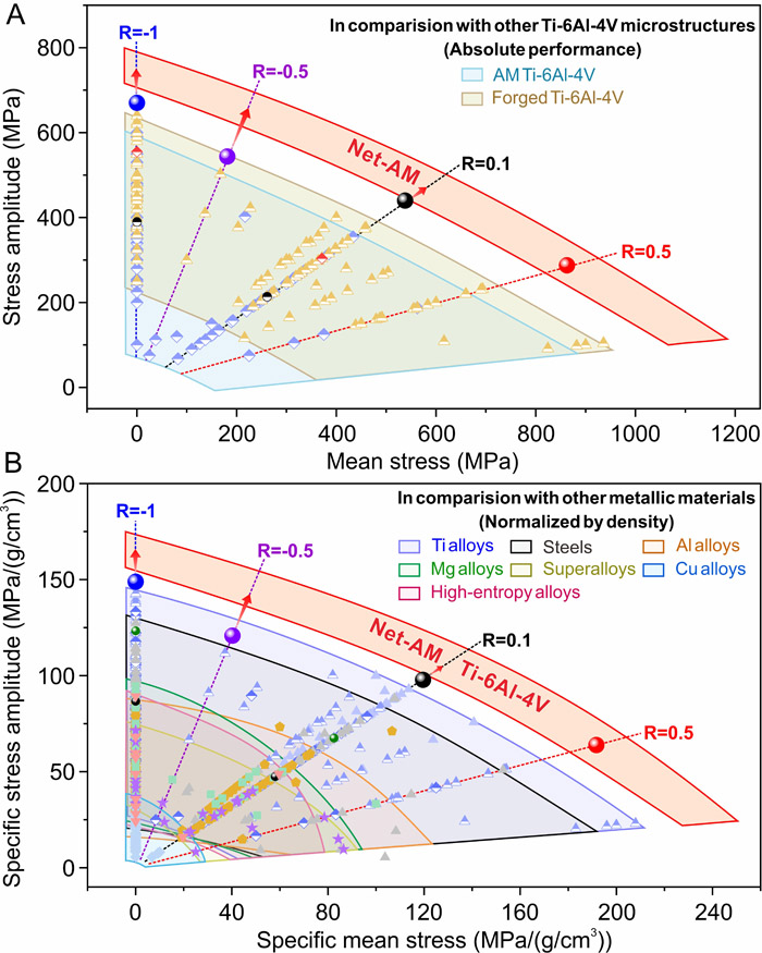 圖3. 與其他Ti-6Al-4V合金和常見的金屬結(jié)構(gòu)材料相比,Net-AM組織Ti-6Al-4V合金在不同應(yīng)力比下的疲勞強(qiáng)度分布