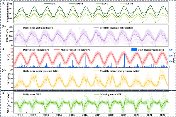圖1?自然修復濕地生態系統環境數據及CO2交換(NEE)長期監測數據