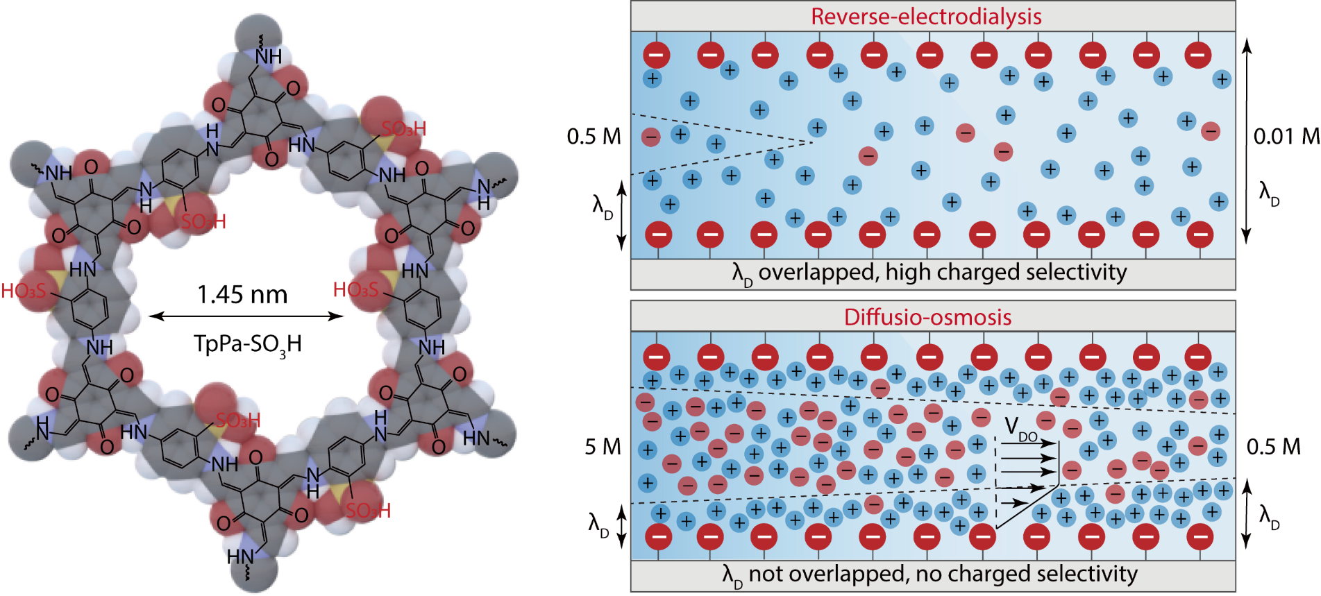 此前,利用單孔氮化硼納米管、石墨納米通道的研究已表明該機(jī)制有望實(shí)現(xiàn)超高功率密度的鹽差能轉(zhuǎn)換,但在膜尺度上仍缺乏相關(guān)研究。研究團(tuán)隊(duì)針對(duì)難以找到合適的膜材料匹配該機(jī)制開(kāi)展研究,發(fā)現(xiàn)利用磺酸共價(jià)有機(jī)框架(COF)膜致密分布的磺酸基團(tuán)、垂直排列的孔道結(jié)構(gòu),可以實(shí)現(xiàn)基于擴(kuò)散-滲透機(jī)制的可規(guī)模化鹽差發(fā)電。