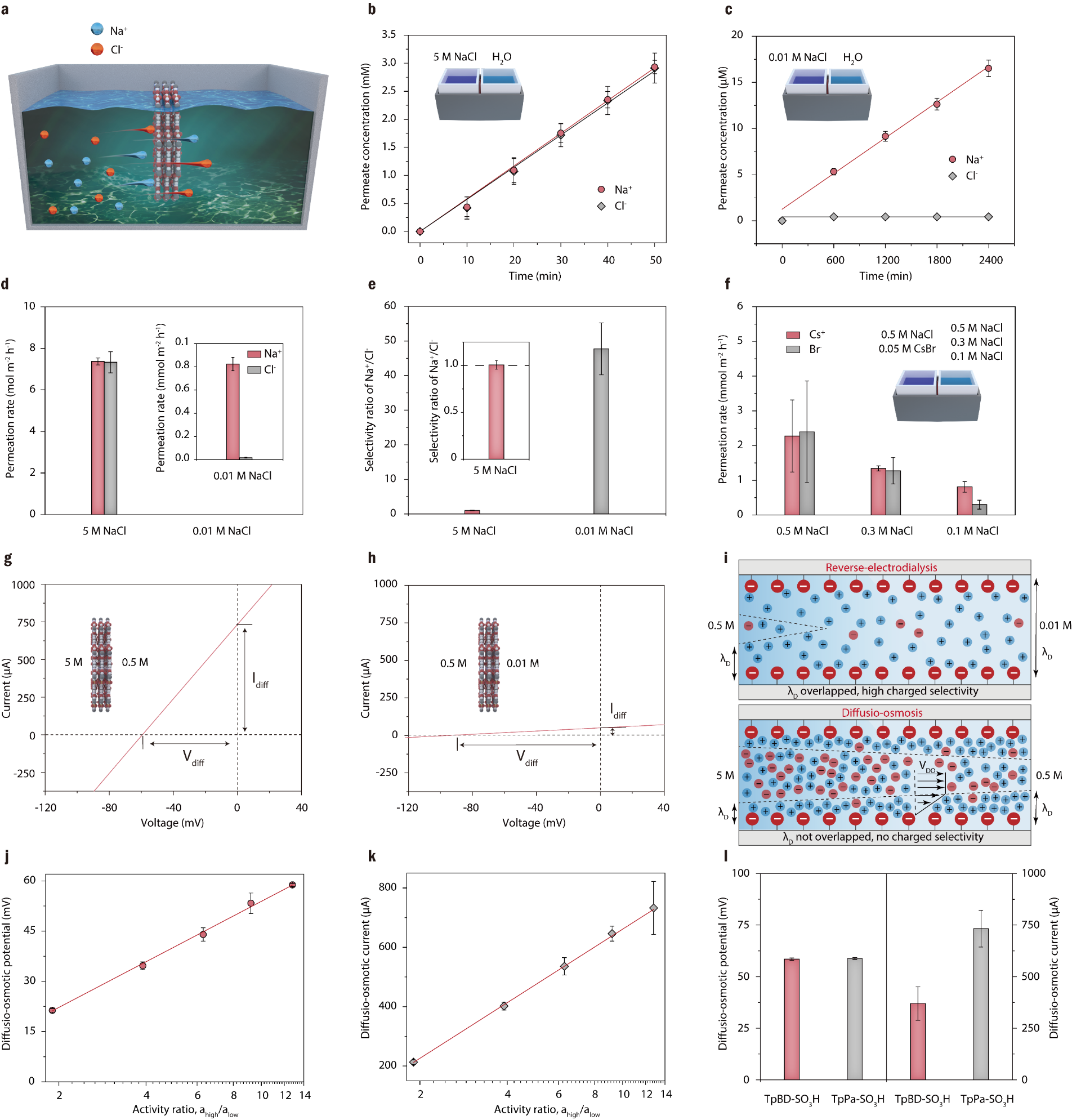 針對(duì)上述問(wèn)題,青島能源所高軍研究員與山東大學(xué)劉鵬教授合作,提出了一種利用擴(kuò)散—滲透(diffusio-osmosis)機(jī)制來(lái)收集鹽差能的新方法,不同于選擇性機(jī)制的RED技術(shù),該機(jī)制產(chǎn)生的電流源于雙電層內(nèi)界面滲透壓梯度驅(qū)動(dòng)的擴(kuò)散—滲透流攜帶的凈電荷,不依賴膜材料的離子選擇性。