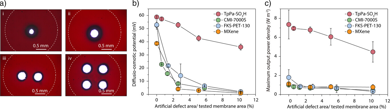 在5 M/0.5 M NaCl濃度梯度下,由于COF通道內(nèi)的德拜長(zhǎng)度(λD)不重合,因此該膜不具備電荷選擇性,Na+和Cl-的滲透測(cè)試進(jìn)一步驗(yàn)證了這一結(jié)論。此外,擴(kuò)散—滲透電流與活度比的對(duì)數(shù)呈線性關(guān)系,表明擴(kuò)散—滲透機(jī)制主導(dǎo)了鹽差能轉(zhuǎn)換過(guò)程。此過(guò)程中,COF致密分布的磺酸基團(tuán)提供了高電荷密度,增強(qiáng)了電雙層內(nèi)界面滲透壓梯度從而能有效產(chǎn)生擴(kuò)散—滲透流,結(jié)合其垂直排列的一維孔道,能高效驅(qū)動(dòng)離子輸運(yùn)。避免了傳統(tǒng)RED對(duì)選擇性的依賴,克服了“通量—選擇性”博弈和濃差極化等問(wèn)題。在0.03 mm2測(cè)試面積下,實(shí)現(xiàn)了101.2 W m-2的最大功率密度,顯著高于多數(shù)已報(bào)道材料。當(dāng)膜面積放大兩個(gè)數(shù)量級(jí)(~20 mm2),功率密度仍能維持在~7 W m-2。這一新機(jī)制的優(yōu)勢(shì)在于不依賴膜材料的離子選擇性,使得體系表現(xiàn)出前所未有的抗缺陷能力,即便在膜上引入超過(guò)測(cè)試面積10%的針孔缺陷,仍能維持穩(wěn)定的輸出電壓與輸出功率,而傳統(tǒng)RED膜在類似條件下幾乎完全失效。這一發(fā)現(xiàn)顯著提高了膜材料的制備容錯(cuò)度,有望降低膜材料的制造成本并提高其工程化應(yīng)用的可行性。