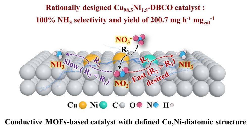 近日,大連化物所太陽能研究部太陽能制儲氫材料與催化研究組(DNL1621組)章福祥研究員團隊聯合計算和數據驅動催化研究組(511組)肖建平研究員團隊,在雙原子電催化劑(DACs)的理性設計與構筑方面取得新進展。研究團隊基于具有優異導電性和水穩定性的金屬有機框架材料(conductive MOF,cMOF),通過對銅-鎳(Cu-Ni)雙原子活性中心的精準調控,實現了在工業級電流密度下接近100%選擇性地高效合成氨,并揭示了硝酸根電還原合成氨過程中的協同“接力催化”機制。