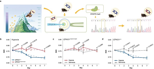 研究運(yùn)用基因編輯技術(shù)首次建立了EPAS1隼型小鼠模型,在模擬慢性低氧環(huán)境下,利用呼吸交換率(RER)來(lái)探究隼型小鼠在低氧條件下的糖、脂代謝偏向性。低氧處理后,隼型小鼠的RER值在0.75附近隨機(jī)波動(dòng),而野生型小鼠的RER值顯著降低(脂代謝偏向),說(shuō)明隼型小鼠在低氧下具有維持糖脂代謝平衡的能力。肝臟轉(zhuǎn)錄組、代謝組分析印證了隼型小鼠肝具有更好的糖脂代謝調(diào)節(jié)能力。功能驗(yàn)證實(shí)驗(yàn)發(fā)現(xiàn)突變型EPAS1蛋白活性降低,鈍化了隼型小鼠的低氧反應(yīng)。此外,研究還分析了行為調(diào)節(jié)在隼型小鼠糖脂代謝穩(wěn)態(tài)維持中的重要作用。從進(jìn)化角度看,隼型小鼠維持糖脂代謝穩(wěn)態(tài)在機(jī)體應(yīng)對(duì)低氧脅迫時(shí)具有重要意義:體重在低氧下可較快恢復(fù),減少體內(nèi)氧化應(yīng)激反應(yīng),并提高急性低氧下小鼠的存活率。