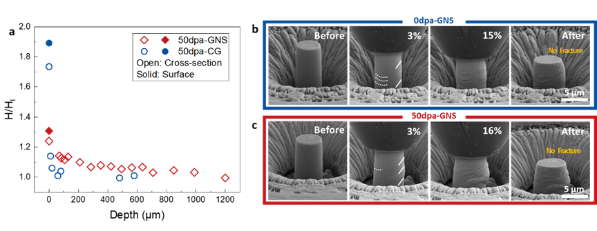 研究團隊通過表面納米化技術在廣泛應用于核反應堆的304NG中制備了由高密度層錯、低能界面和位錯網絡等結構特征組成的納米結構,使得該材料具有優異的抗輻照能力。例如,在室溫超高劑量(155 dpa)輻照后,GNS 304NG樣品中的輻照缺陷密度和尺寸僅為粗晶樣品中的3.8%和63%;在高溫(450 °C)輻照時GNS 304NG樣品也同樣表現出比粗晶樣品更為優異的抗輻照性能。結合微觀結構表征和分子動力學模擬,研究團隊發現,GNS 304NG優異的抗輻照性能與輻照誘發的自適應馬氏體相變密切相關:輻照缺陷與材料中預制的層錯相互作用而誘發馬氏體相變,加速輻照缺陷的消失;此外,高密度層錯還促使馬氏體相向周圍不斷拓展,在加速消耗輻照缺陷的同時形成連續分布的馬氏體相。進一步的微納力學實驗證實,GNS 304NG中大規模的自適應馬氏體相變不會造成材料力學性能的惡化,將傳統上輻照誘發馬氏體相變造成材料脆化這一有害過程轉變為一個有益的過程。由于自適應馬氏體相變機制在從低劑量到極高劑量、從低溫到高溫的輻照下均保持有效,加之所采用的表面納米化技術具有低成本和工業上易于實現的特點,本工作表明,將表面納米化技術與自適應馬氏體相變結合,可為現行及未來核設施提供一種大幅提升抗輻照能力的策略,應用于奧氏體不銹鋼及鈦合金等在輻照下可發生馬氏體轉變的金屬材料中。