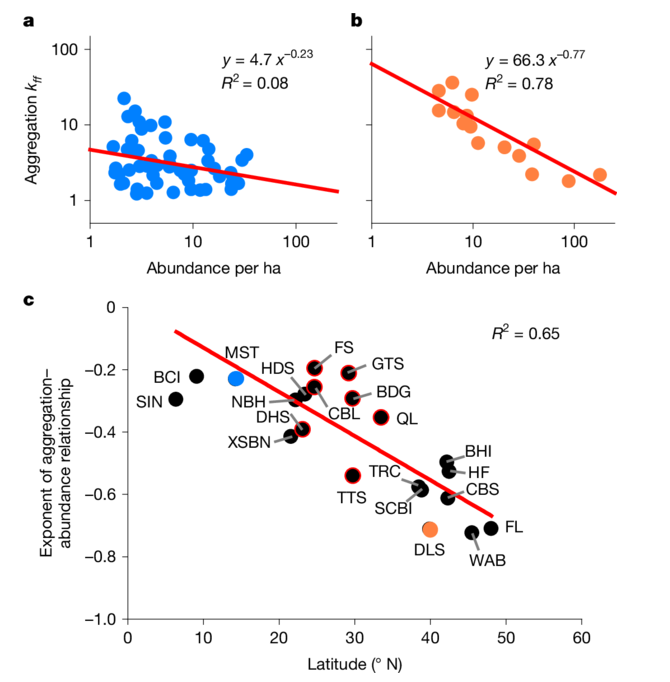 圖1.不同緯度梯度下森林樹種聚集度和多度關系(a 熱帶森林,b 溫帶森林,?c 緯度格局)