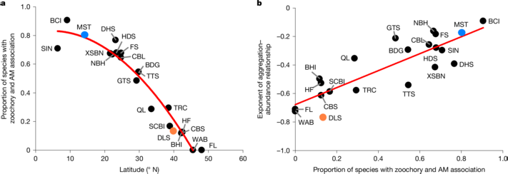 為了揭示其潛在的生態機制,我們提出了一種“擴散方式-菌根類型協同演化”的新觀點,結合近期發現的植物擴散方式與菌根共生的演化關系,強調動物傳播方式和菌根類型共同塑造了這一緯度梯度格局。森林中的樹木主要依賴風、重力或動物來擴散種子,而這三種擴散方式在不同緯度的占比不同:熱帶森林70-80%樹種依賴動物傳播,這些動物會將種子帶離母樹,使得幼樹分布更分散,形成遠離母樹的隨機斑塊分布。溫帶森林的種子傳播主要依靠風力和重力,這意味著種子往往掉落在母樹附近,導致稀有樹種更容易形成高度聚集的空間分布。這種差異從森林更新的角度解釋了為什么溫帶森林中的稀有樹種比熱帶森林中的稀有樹種更傾向于“抱團”生長。此外,菌根是菌根真菌與樹木根系形成的共生結構,不同類型的菌根影響樹木的存活策略:在熱帶森林,大多數樹種與叢枝菌根(AM)真菌共生。AM菌根對土壤病原菌的抵抗作用有限,導致樹木在母樹附近容易受病原菌侵害而降低存活率,造成熱帶樹種更傾向于遠離母樹分布。在溫帶森林,大多數樹種依賴外生菌根(EM)真菌,這種菌根具有較強的病害防護作用,使樹木在母樹附近更容易存活,從而導致較高的聚集性。這種差異從樹種存活的角度解釋了為什么溫帶森林中的稀有樹種比熱帶森林中的稀有樹種更傾向于“抱團”生長。通過收集上述樣地內720個樹種的傳播方式與菌根類型數據,我們證實了動物傳播比例和AM樹種比例隨緯度降低而升高的趨勢(圖2a),并且動物傳播和AM樹種比例可以共同解釋樹種聚集度—多度關系的緯度分布格局(圖2b)。