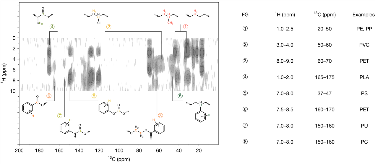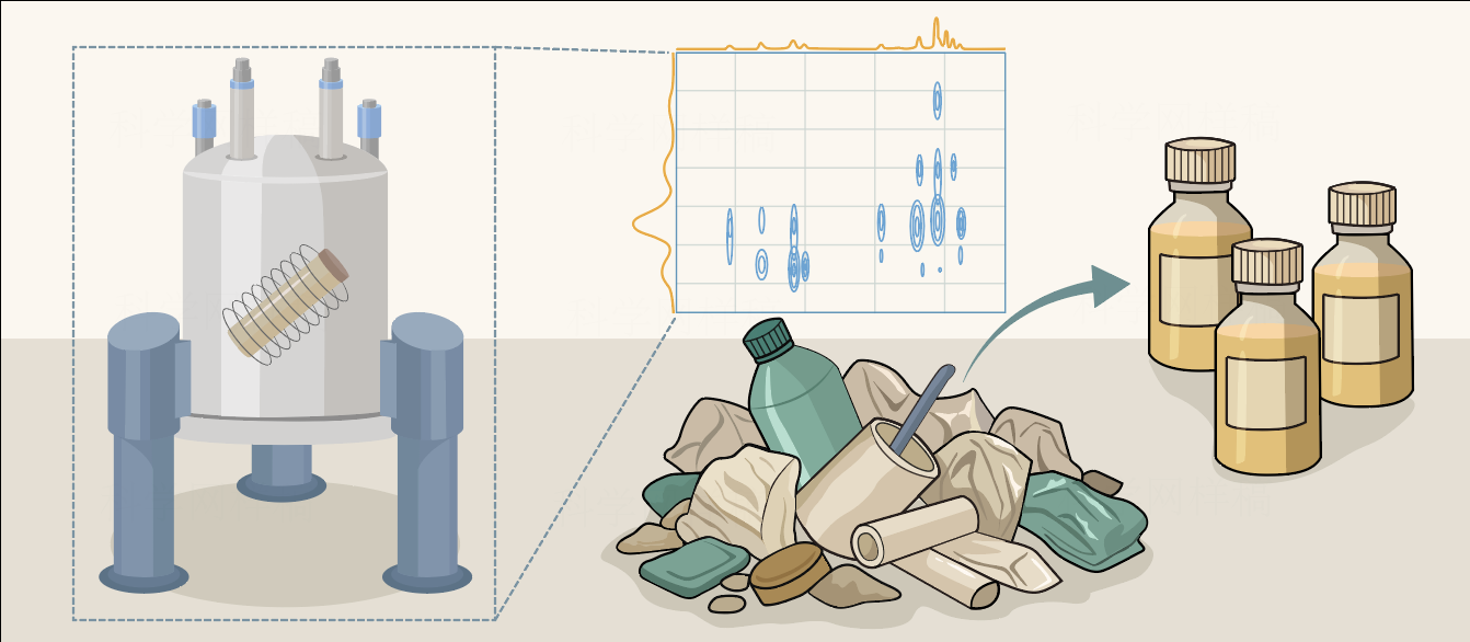 在本工作中,研究團隊創(chuàng)新性地利用同核去耦的異核相關(guān)核磁共振方法(1H-13C FSLG-HETCOR NMR),通過優(yōu)化轉(zhuǎn)速、接觸時間和同核去耦射頻場強度等參數(shù),以13C標記的酪氨酸鹽酸鹽為標準樣品,結(jié)合標準化學品塑料混合制成的模型樣品,實現(xiàn)了在含有PS(聚苯乙烯)、PLA(聚乳酸)、PU(聚氨酯)、PC(聚碳酸酯)、PVC(聚氯乙烯)、PET(聚對苯二甲酸乙二酯)、PE(聚乙烯)和PP(聚丙烯)八種塑料混合物中單一組分的指紋峰識別。所獲得的譜圖具有強度高、間接維分辨率好的特點,可以有效識別塑料混合物中各種官能團并監(jiān)測其演變。進一步,團隊在真實廢塑料混合物的分離與轉(zhuǎn)化過程的全程監(jiān)測證明了該方法的可行性、有效性和普適性。核磁共振技術(shù)全程監(jiān)測了從廢塑料混合物到多種高價值化學品的轉(zhuǎn)化過程。