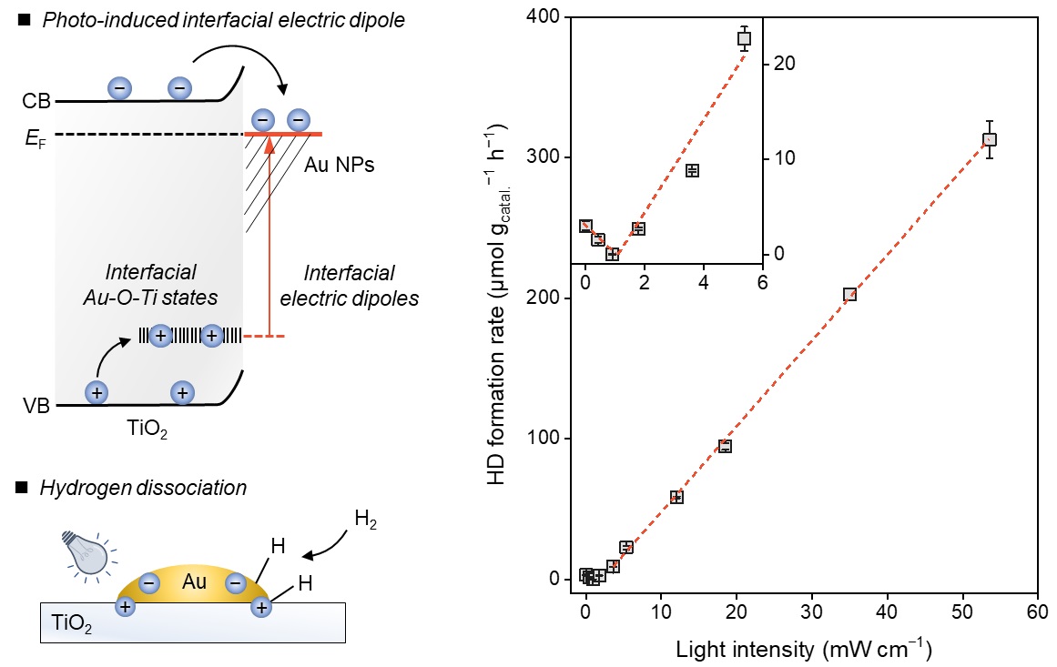 科研人員以金/二氧化鈦(Au/TiO2)為模型催化劑,利用紫外光激發TiO2,研究結果認為:光激發產生的電子可遷移到Au納米顆粒上而被束縛;同時,由于Au納米顆粒和TiO2的界面存在Au-O-Ti組成的缺陷態,光生空穴會在界面處被捕獲。研究發現,由于空穴和電子分別在界面Au-O-Ti和Au納米顆粒上,從而形成了空間鄰近的束縛態電子-空穴對。Au/TiO2在常溫條件下同時存在氫氣異裂的熱催化機制,與Au/TiO2上光催化氫氣異裂的機制疊加,使科研人員觀察到該反應活性隨著光強增強先降低后呈線性增加的現象。