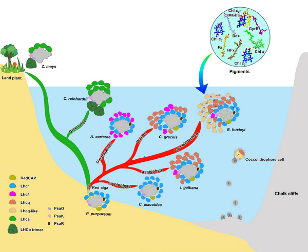 光系統(tǒng)I-捕光天線復(fù)合體在光合作用中負(fù)責(zé)將光能轉(zhuǎn)化為化學(xué)能。由于光合生物對(duì)不同光環(huán)境的適應(yīng)性,該復(fù)合體在結(jié)構(gòu)和大小上呈現(xiàn)顯著差異。特別是從海岸帶向“陸”和“洋”兩個(gè)方向的環(huán)境適應(yīng)過(guò)程中,光系統(tǒng)I-捕光天線復(fù)合體更是經(jīng)歷了深刻的演化。顆石藻起源于古海岸帶,于中生代征服遠(yuǎn)洋并達(dá)到繁盛,對(duì)當(dāng)今全球的氣候和生態(tài)意義重大。其中,赫胥黎艾氏藻(Emiliania huxleyi)是顆石藻類(lèi)群中最著名的模式生物,是海岸帶生物學(xué)中的重要研究對(duì)象。因此,赫胥黎艾氏藻光系統(tǒng)I-捕光天線復(fù)合體光能利用分子機(jī)制的研究對(duì)于海岸帶生物適應(yīng)性進(jìn)化的研究意義非常重大。