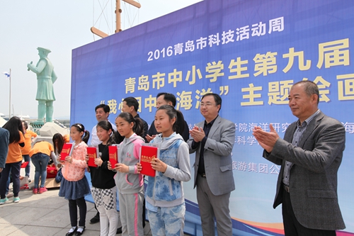 由青島市教育局、青島市科技局、中國科學院海洋研究所、中國海洋湖沼學會共同主辦,青島市少年科學院承辦的第九屆青島市中、小學生“我心目中的海洋”主題繪畫活動在青島銀海大世界成功舉辦。本屆繪畫活動首次通過網絡、微信等平臺征集作品,吸引了全市242所學校的7906名中小學生積極參與,由專業美術老師評選出一二三等獎。14日上午,邀請到100名獲獎同學到現場作畫,在百米長卷上揮毫潑墨,用五彩繽紛的畫筆描繪出同學們心目中的海洋世界。青島市科協主席胡辛、海洋所黨委書記王凡等領導為獲獎同學頒獎。