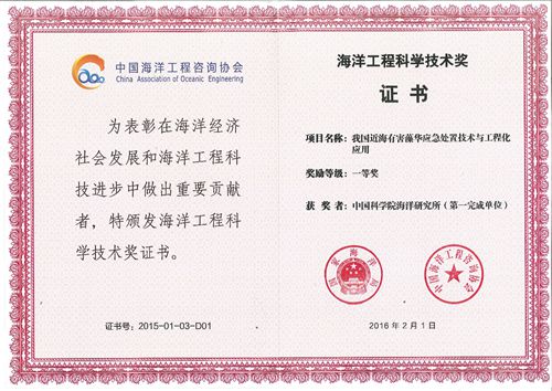 5月22日,2015年度海洋工程科學技術獎頒獎大會在北京召開,中國科學院海洋研究所俞志明研究員等完成的“我國近海有害藻華應急處置技術與工程化應用”項目獲得一等獎。