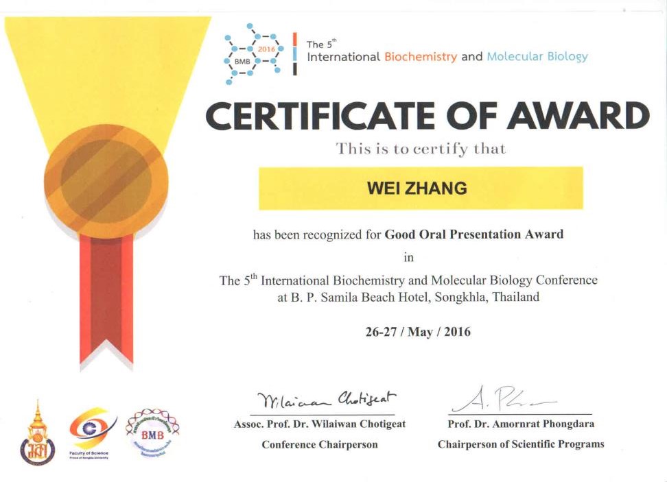 張偉的口頭報告取得了較好的反響,并被評為該次大會的“優秀口頭報告”。與會期間,張偉和參會代表在生物化學、分子生物學、酶工程等生物化學和技術領域進行了探討交流,與泰國宋卡王子大學分子生物技術與生物信息學系教授Amornrat Phongdara、化學系教授Vatcharin Rukachaisirikul及泰國國家癌癥中心的Danai Tiwawech教授達成了初步合作意向。通過本次會議,進一步增強和擴大了酶工程團隊及研究所的國際影響力和知名度。