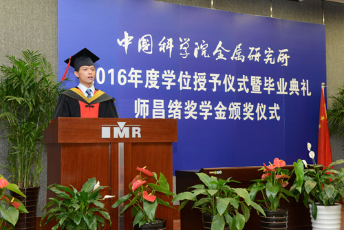 來自金屬腐蝕與防護實驗室的2012級博士生李天書代表全體畢業生發言,他首先向多年來支持同學們在求學道路上不斷前行的各位導師、家長以及所領導們表達了最真摯的感謝。時光荏苒,同窗情誼,已變成揮手作別的離歌,他與每一位畢業生共勉“希望大家畢業后在各自領域里,依然會秉承金屬所人的優異品質,以其所言所行,作為自己最好的名片,得到各界的認可,為金屬所做最好的代言!”