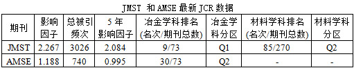 據最新發布的SCI-JCR期刊引證報告,金屬所2本英文期刊的影響因子分別為:《JMST》2.267,《AMSE》(金屬學報-英文版)1.188。SCI數據均創歷史新高,特別是《JMST》突破了2.0大關,在SCI冶金學科排名第9,進入Q1區,在材料類綜合學科排名第85,進入Q2區,位居國內材料綜合類學術期刊榜首。
