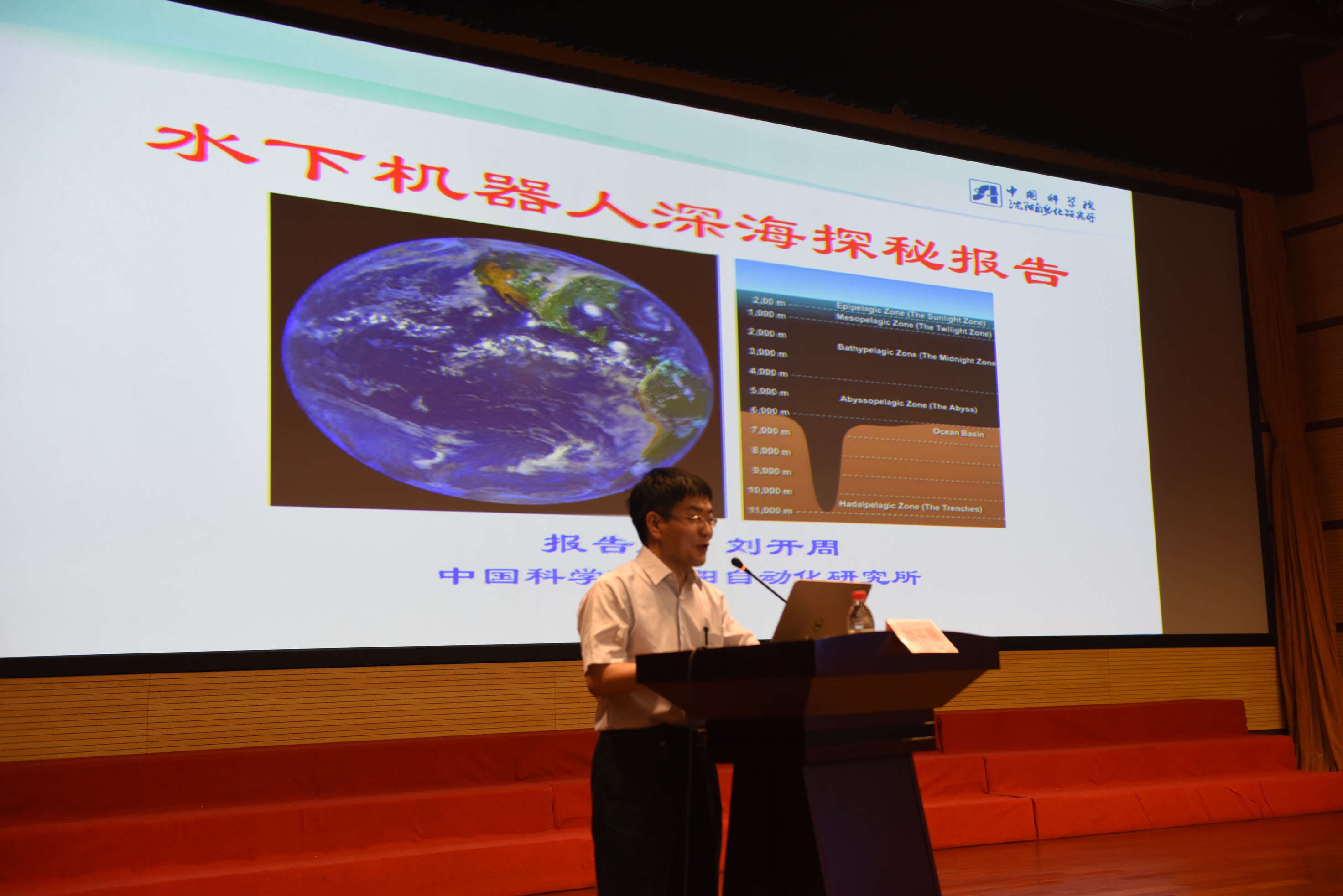 報告現(xiàn)場,劉開周通過珍貴的資料,與大家分享了自己親身參與的深潛經(jīng)歷,生動形象地展示了奇妙的海底世界和一些鮮為人知海試背后的故事,緩緩掀起“蛟龍?zhí)枴钡纳衩孛婕啞!爸袊札執(zhí)枴d人潛水器順利到達7062米深的海底,在世界載人深潛的榜首刻下了中國人的名字,是世界同類型載人潛水器的最大下潛深度,這是中國人的驕傲。”劉開周的報告不時贏得現(xiàn)場觀眾陣陣掌聲。在報告中,劉開周還介紹了沈陽自動化所水下機器人家族的其他“成員”:“潛龍”系列自主水下機器人、北極科考機器人、“龍珠”號ROV、水下滑翔機、水下機械手……令現(xiàn)場觀眾大開眼界。