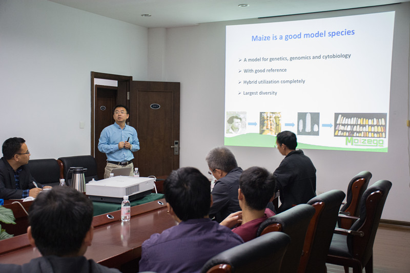 嚴建兵教授介紹了玉米在世界各地的種植分布情況,指出玉米作為主要糧食經濟作物和模式植物研究的重要性和必要性,詳細介紹了其實驗室在玉米重要種質資源收集和玉米基因組學研究方面的工作,并與科研人員分享了其團隊利用玉米自交系群體,通過全基因組關聯分析(GWAS)解析影響玉米籽粒發育、油脂積累和其他重要代謝物合成等遺傳學基礎的經驗和成果。報告結束后,嚴教授還與現場的科研人員進行了親切交流,并結合自身科研經歷和經驗,與大家探討了如何發現科學問題,如何做好科研工作和如何培養科研合作精神等熱點問題。