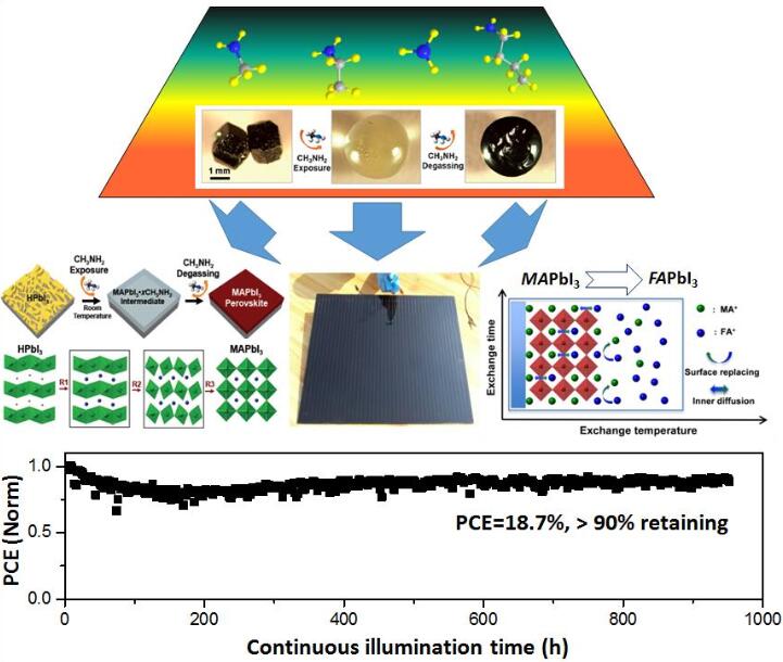 目前常用的有機(jī)-無機(jī)鈣鈦礦材料體系與傳統(tǒng)純無機(jī)太陽能材料區(qū)別在于有機(jī)陽離子的存在,因此如何調(diào)控有機(jī)陽離子實(shí)現(xiàn)大面積高度均勻的鈣鈦礦薄膜制備是一項(xiàng)非常有挑戰(zhàn)的工作。青島能源所青島儲(chǔ)能院自2013年開始一直致力通過對(duì)有機(jī)單元的調(diào)控實(shí)現(xiàn)對(duì)鈣鈦礦材料和器件性能的優(yōu)化,該院研究人員與美國布朗大學(xué)、美國可再生能源實(shí)驗(yàn)室緊密合作開發(fā)了甲脒鉛碘新鈣鈦礦材料體系(Chem. Mater. 2014, 26, 1485;Patent: ZL201310257024.0),提出了鈣鈦礦太陽能電池薄膜的氣體修復(fù)技術(shù)(Angew. Chem. Int. Ed. 2015, 54, 9705; J. Am. Chem. Soc., 2016, 138, 750; Angew. Chem. Int. Ed. 2016, 55, 14723;Patent: 2015101841 50.7),這為鈣鈦礦器件從實(shí)驗(yàn)室到商業(yè)化快速過渡奠定了堅(jiān)實(shí)的基礎(chǔ)。