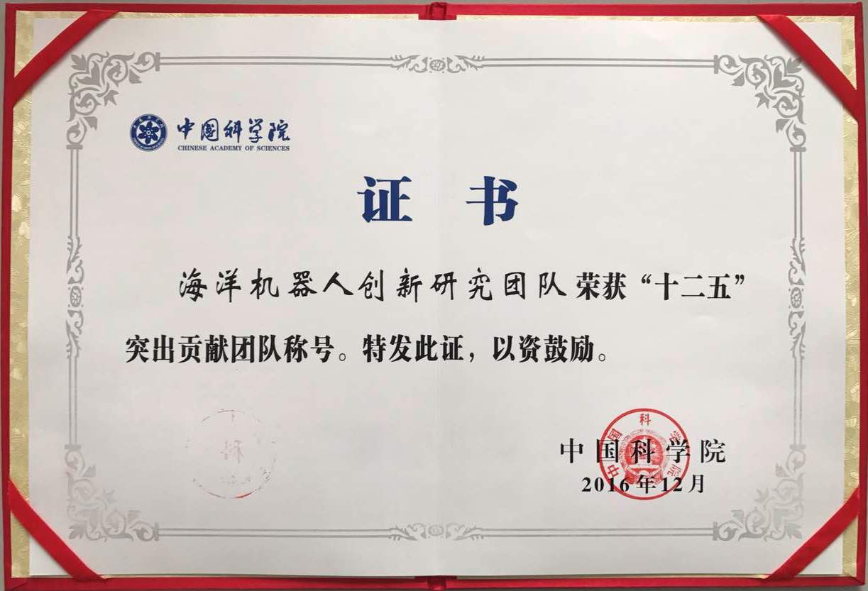 “中科院突出貢獻(xiàn)團(tuán)隊”由各分院推選候選團(tuán)隊,院人事局組織評選,并經(jīng)公示和院長辦公會審定,旨在表彰“十二五”期間在“三個面向”方面取得突破性重大科研成果,在本研究領(lǐng)域有較大影響力,人才培養(yǎng)、團(tuán)隊建設(shè)成效顯著,團(tuán)隊結(jié)構(gòu)合理,成員信念堅定、素質(zhì)優(yōu)良的科研團(tuán)隊。(海洋信息技術(shù)裝備中心、水下機(jī)器人研究室)